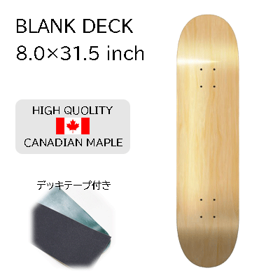 ブランクデッキ スケートボード商品説明 素材 カナディアンメープル サイズ ■幅/8.0(インチ) ■長さ/31.5(インチ) 一般男性向けサイズ ※1インチ:約2.54cm 特典 デッキテープ付き 注意 画面上と実物では多少色具合が異なって見える場合もございます。